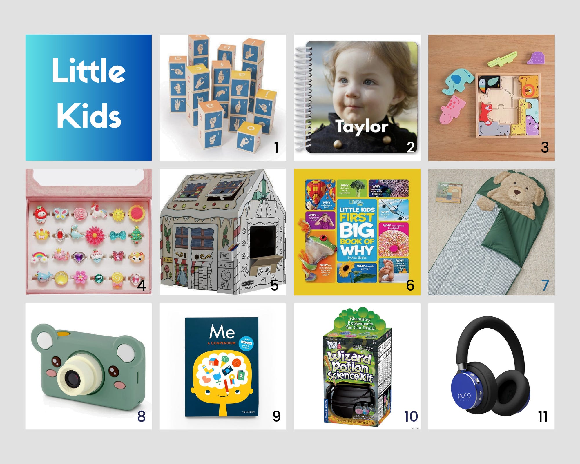 Custom board book of names and faces: This is one of my favorite gifts for babies and toddlers—it’s a custom book with faces of family members and friends. I had one for each of my kids when they were little.